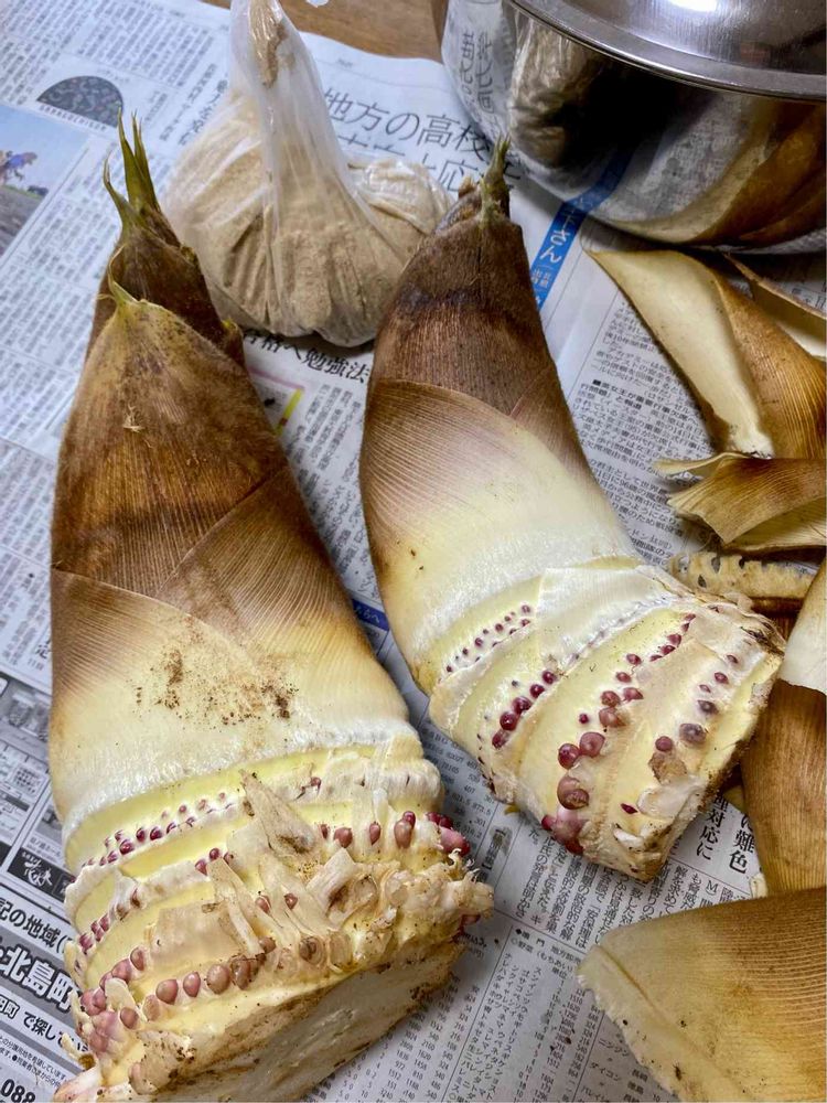 掘ってすぐに持って来てくれたので、茹でると、とても柔らかく、明日タケノコご飯にするのが、楽しみです😊