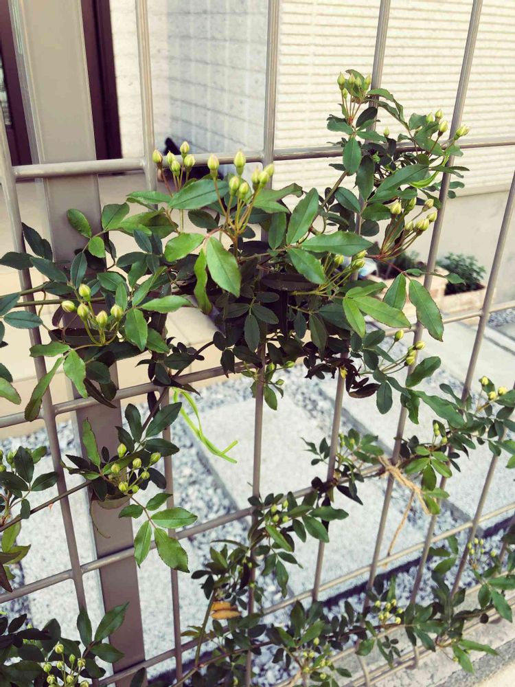 玄関先のフェンスのモッコウバラにつぼみがつきました♪早く咲いて欲しいな〜