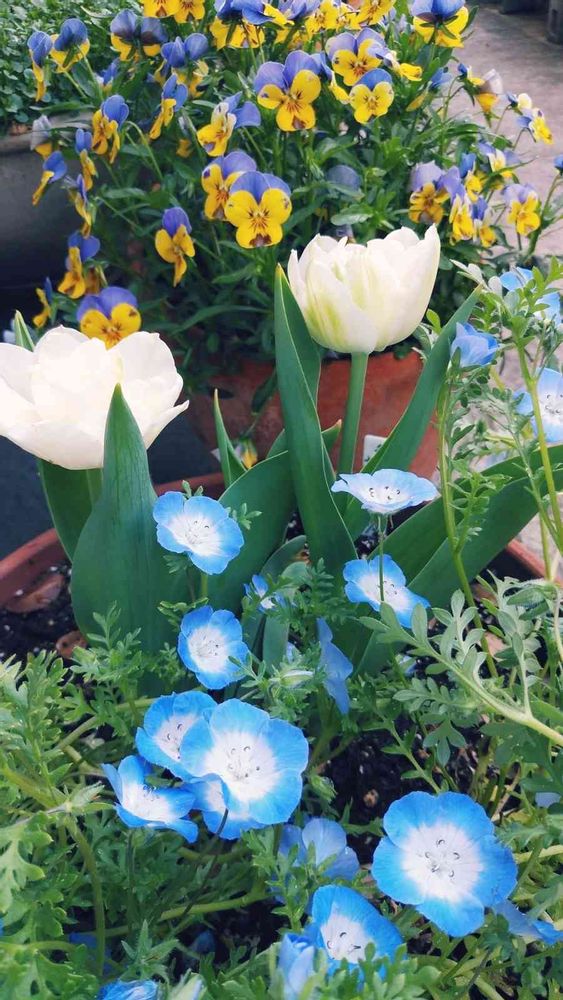 ネモフィラとチューリップの相性最高だよね、白もいいね