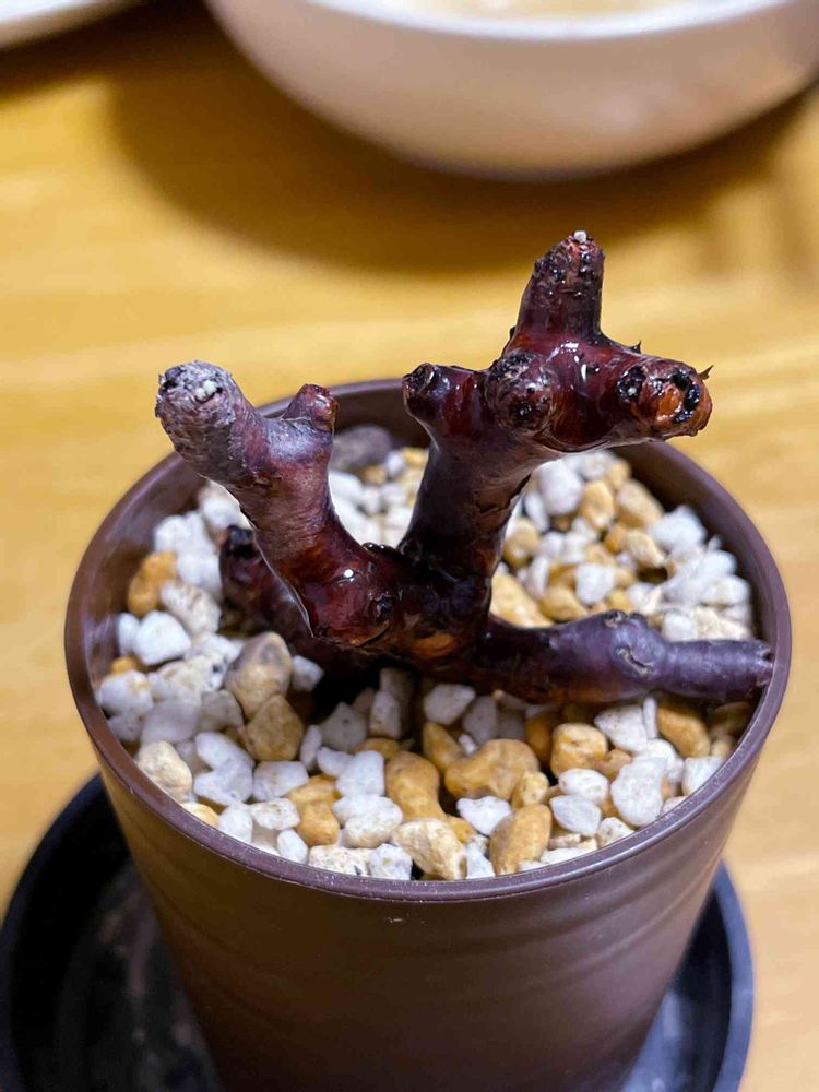 購入先の方の発根方法は、①普通に水遣りして乾いたら水遣り、②腰水管理、だそうです。あくまで参考程度にとの前置きだったのですが、挿木に体力があれば、①で発根するようで、1ヶ月経っても動きがなければ②の腰水管理にする様です。