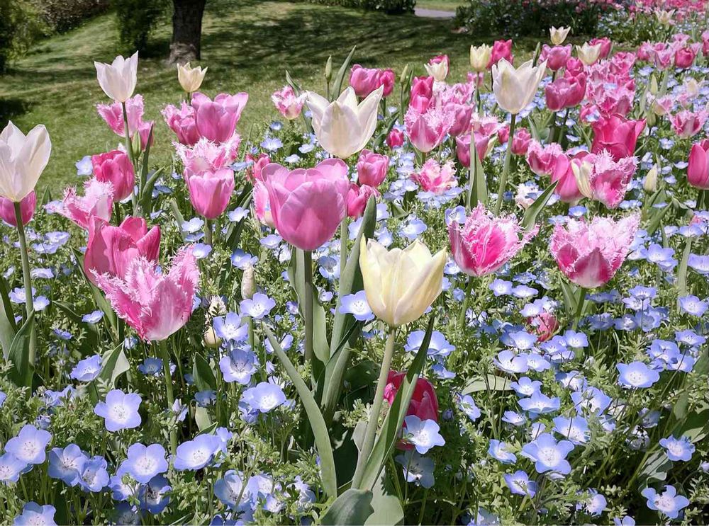 見頃のチューリップとネモフィラ