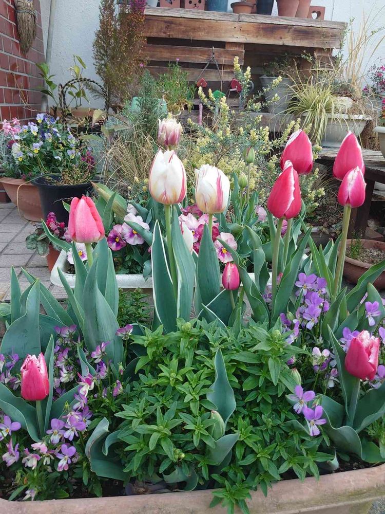 寄植えに埋め込んでおいたチューリップが次々と咲いてきました