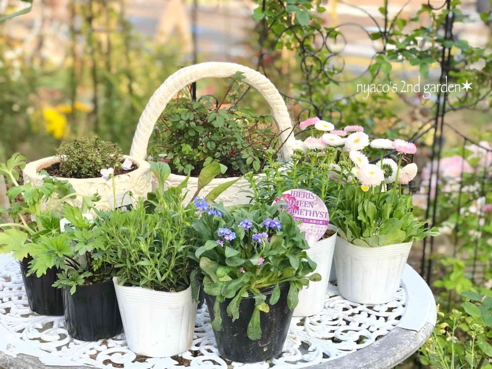 第2ガーデンのすぐ近くに住んでる友人からガーデンテーブルとチェアを譲ってもらいましたん🎶🎵✨こんなふうに買ってきた苗も白のテーブルの上にポンと置くだけでやけにかわいく見えるよ〜( *¯ ꒳¯*)✨ 今まで地面に並べてたのと大違い😂💦