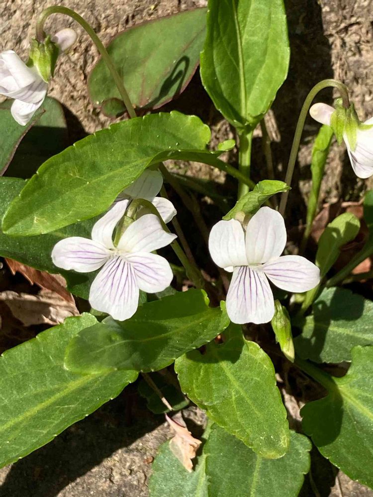 野山から人通りが少しある道に出るとスミレの種類も野良ちゃんに変わってきました。アリアケスミレ。去年は路肩の土埃の中で咲いてるのを見ました。白地に紫条が映えます。側弁基部は有毛。葉っぱはホンスミレに似てますが、ホンスミレは葉っぱも花も上方向にピンピン伸びる感じです。4/9町田市にて