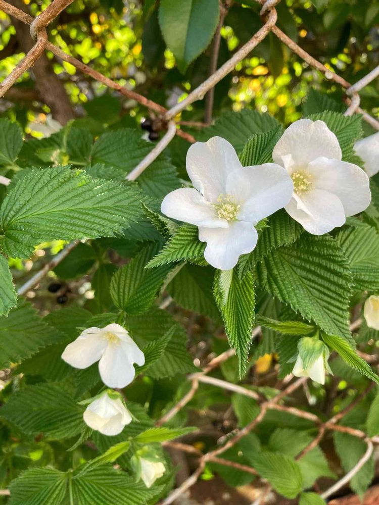 ん? この花、この葉っぱ、もしや噂の実物見たことないはずの白い山吹やん😵😵😵