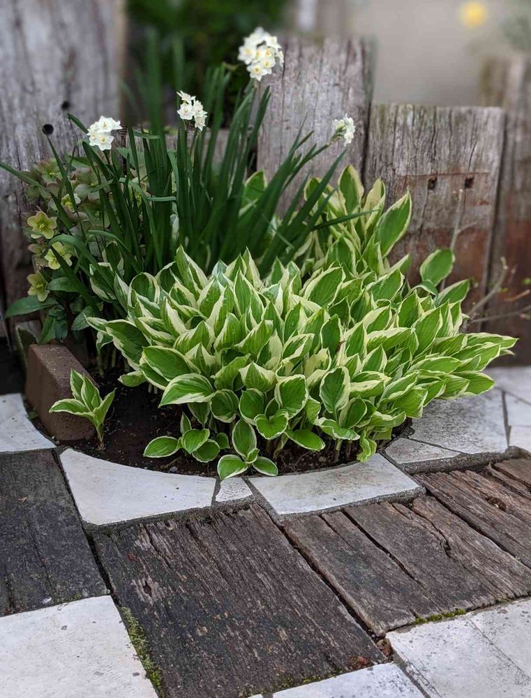 それと斑入りで葉が大きく、株も大、中型に成るホスタを用意します鉢に黒いビニールポットが隠る位ウォタースペースを取ってホスタを真ん中に植え付けて、成長したらアッチコッチに気分に合わせて移動して楽しみます。南向きでも真夏以外なら大丈夫です🌿✨
