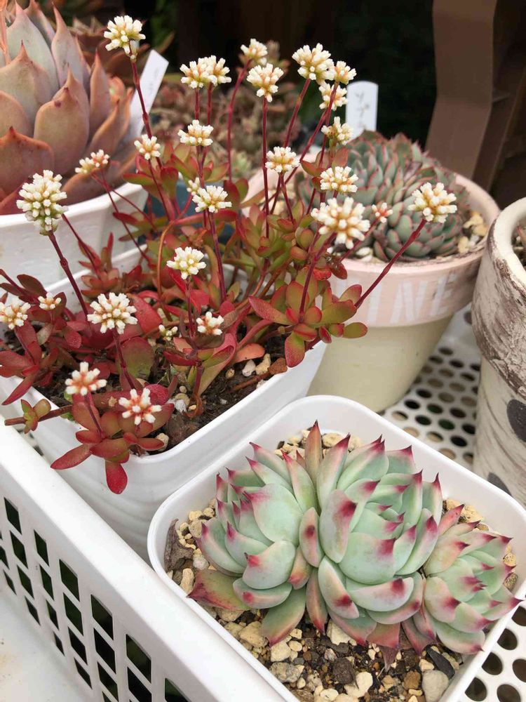 と雨☔みたいです😥 紅稚児の白いお花、可愛いですよね〜💖 多肉を始めた頃に、可愛いからほしい〜って