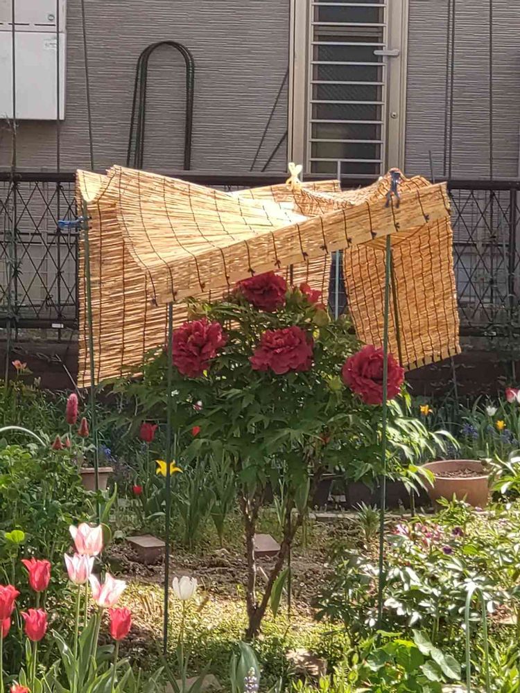 私も、紫陽花を西日から守っています。すだれ作戦でね。