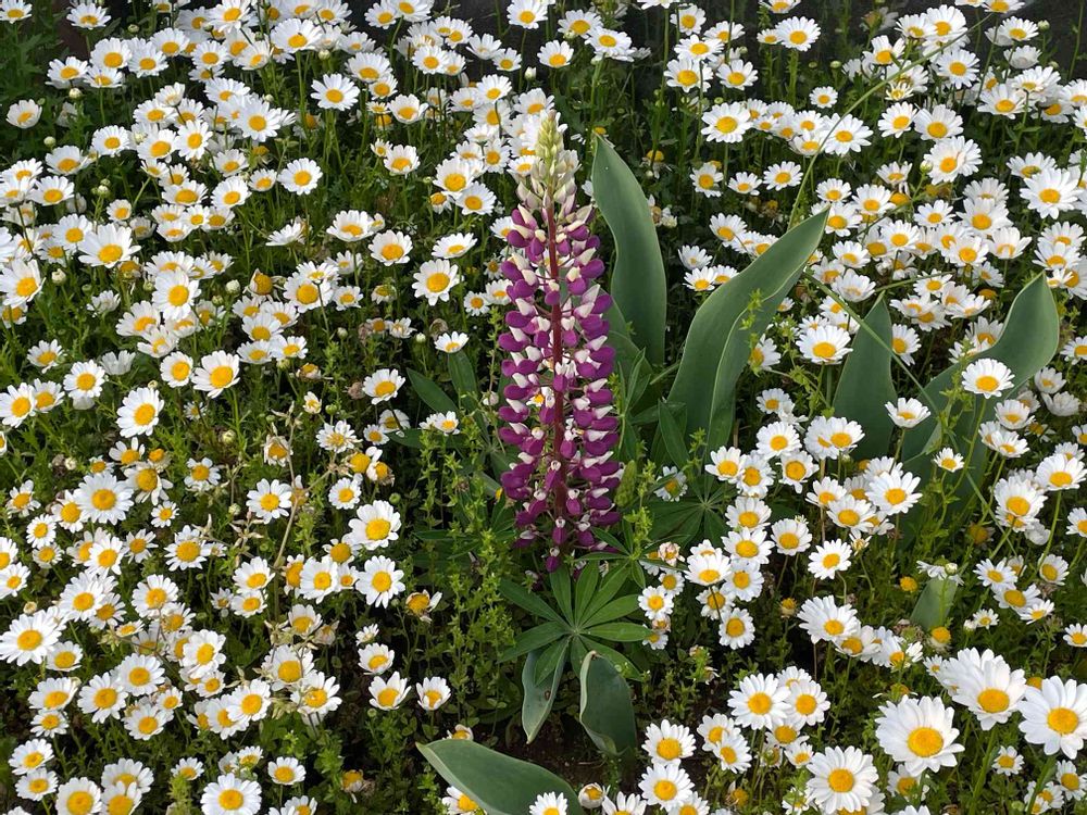 我が家のノースポール。の中に勝手に出たルピナスが😆種が飛んだのかな🤔周りに守られている感じです😊