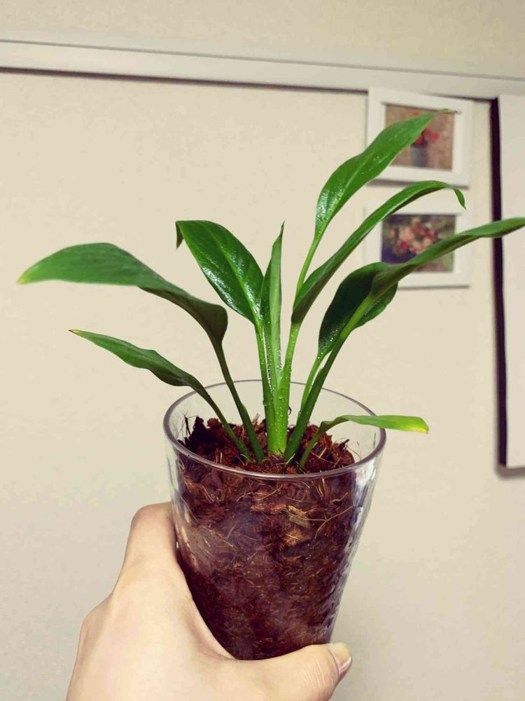 ベラボン第二弾♡スパティフィラム、新芽出てきてたけど周りの葉っぱがなんとなーく元気なかったから根の周りが見えやすい透明プラグラスに!すくすく育ちますように。