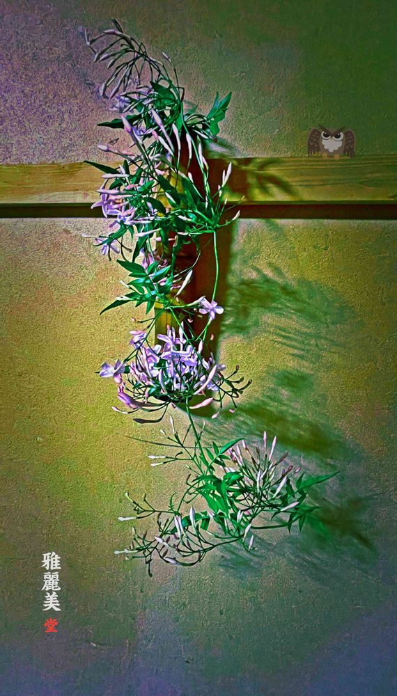 ♡この写真画像は、万葉の中庭に咲いていた羽衣ジャスミンを、居間の入り口直ぐのところ生花とし生けたものデス🐶