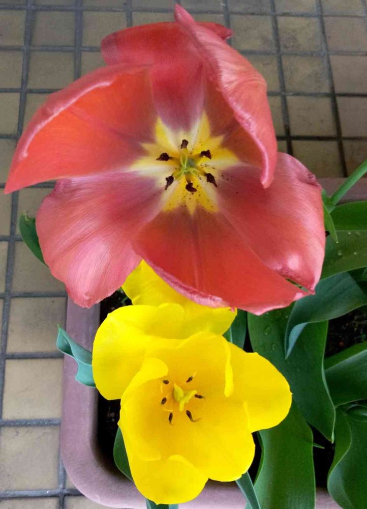 通りすがりに見かけました歩道脇の花壇の赤色と黄色のチューリップ☺️
