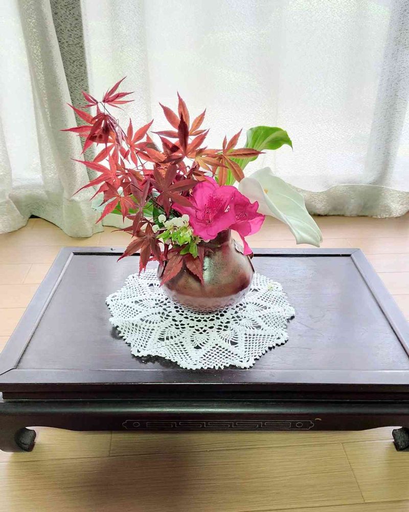 面白い味が出ています。ただ、白いカラーは他の花材や花器とに関連性が薄いですね。アクセントにするなら今入っている場所ではきつい気がします。