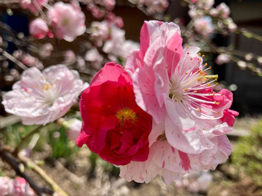 源平咲き🌺🤍🌸赤•白•紅白の絞り3色の花が競うように咲く美しいハナモモです。