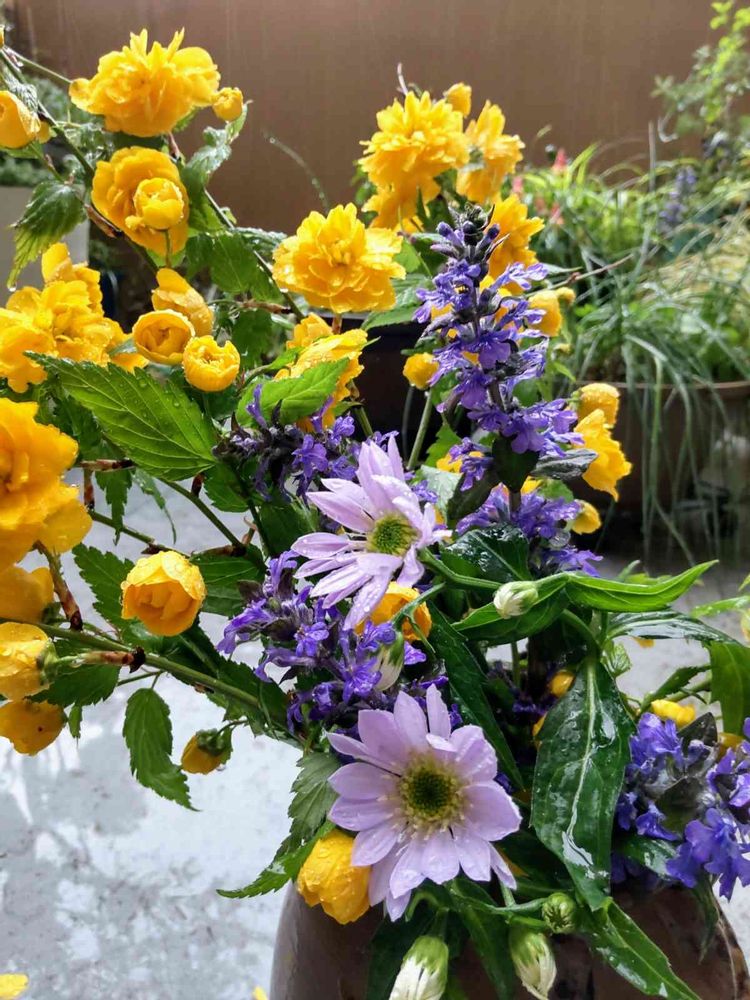 摘んで、わが家のベランダ☔️に濡れていい感じ💜💙💚💛