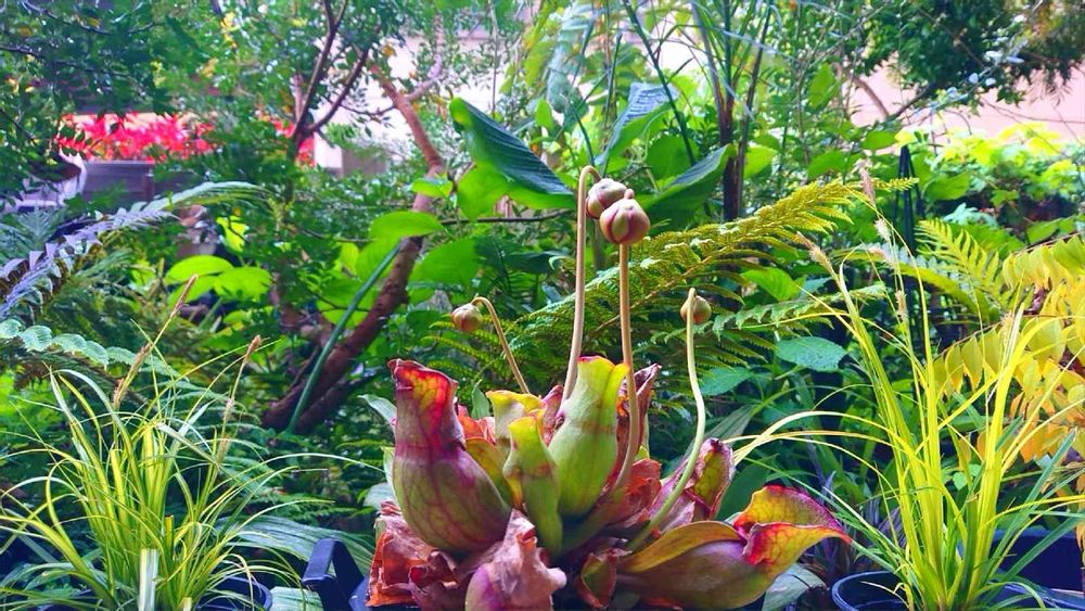ずっと腰水管理のサラセニア。一回り大きな鉢に植え替え完了。食虫植物に詳しい人に「簡単なのって何ですか?」と聞いたところ、断然サラセニアと聞いて育て始めました。屋外腰水、直射日光ガンガンでもへこたれず、ホントに簡単です。冬にボロボロになりましたけど、新しい葉も出てきたし、花も咲きそう。健康第一、丈夫で良い子です。