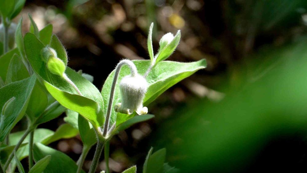 早朝のクレマチス・コアクチリス(インテグリフォリア系)です。朝日を浴びて光り輝いています。