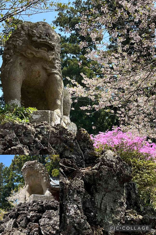 狛犬と🌸桜、ミツバツツジと獅子のコラボレーションが何とも言えないダイナミックな雰囲気を演出!