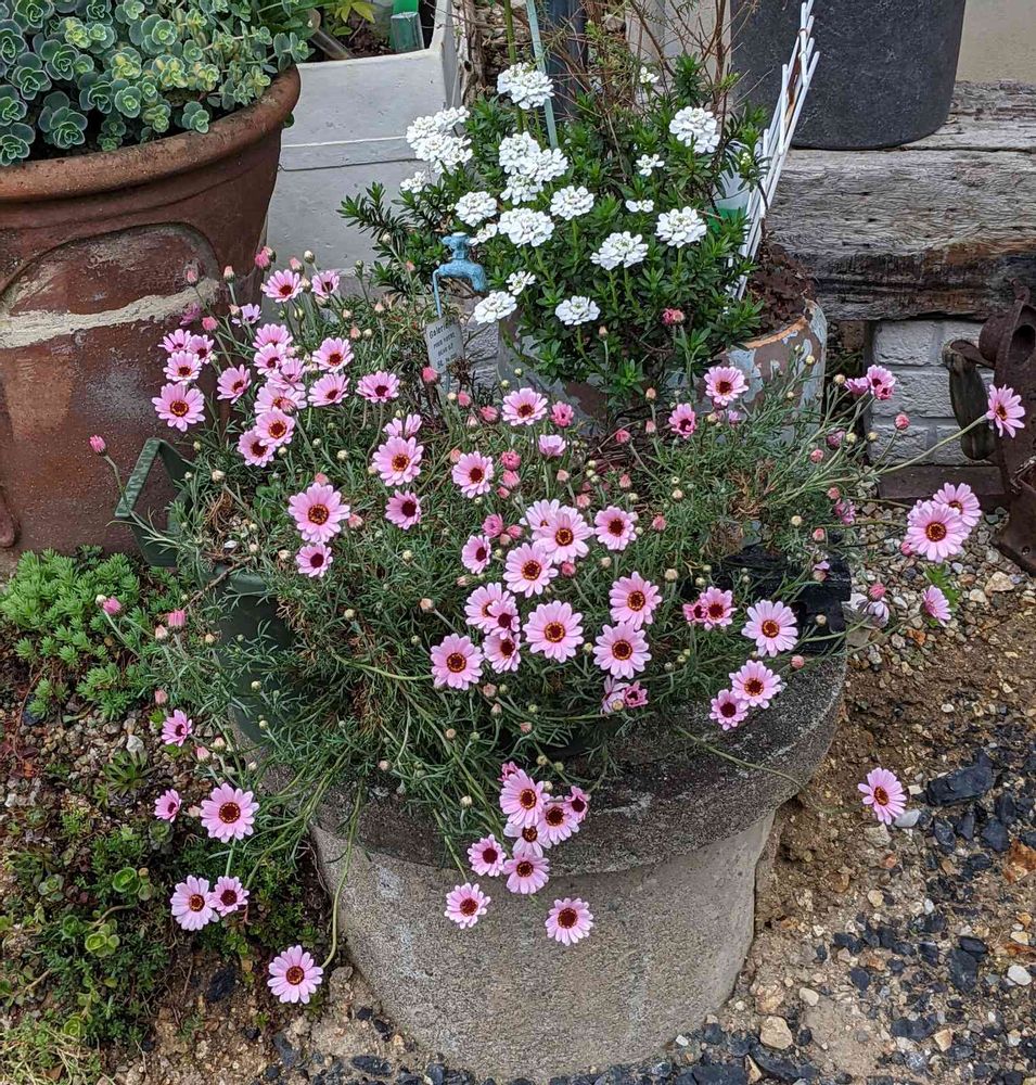 お手入れもしてなくて 咲き揃えてあげることは出来なかったけど ローダンセマムが可愛く次々と咲き出しました😍蕾もた~くさん 嬉しいなあ😆💕後ろの白い子も(アリッサム?)←ニセ情報😅(イベリスです)45さんありがとうね〜☺️🙏 放置してても咲いてくれます😘