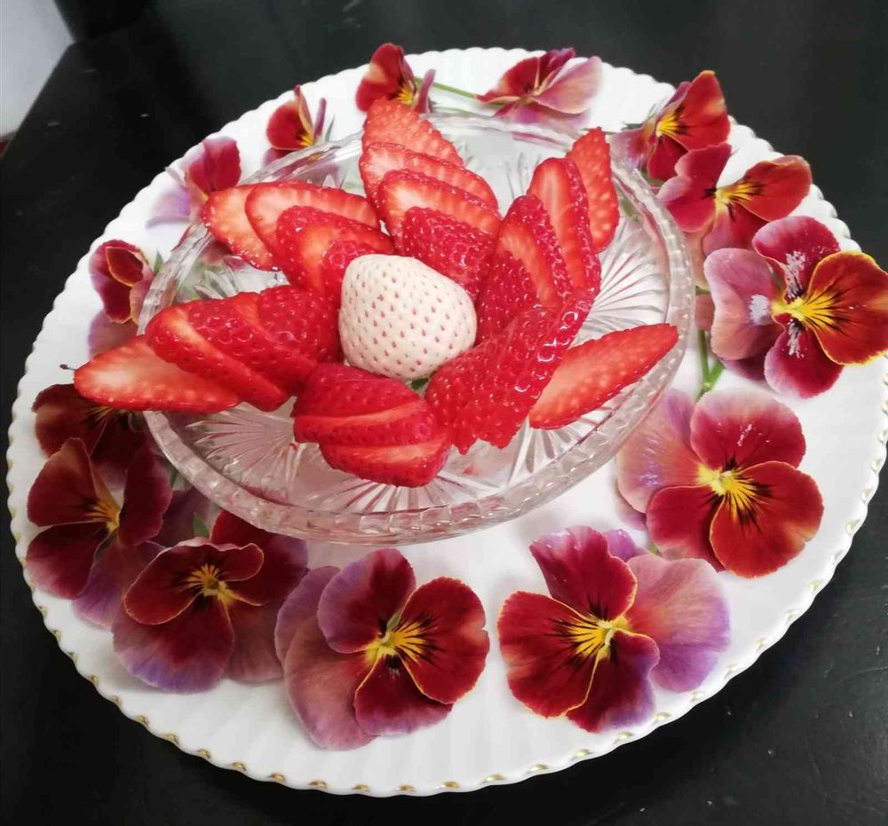 紅ほっぺ🍓をカットし白おとめを真ん中にしてフルーツ皿に盛り付けて♡ 周りには花夢園芸ビオラさんを飾って出来上がり✨✨