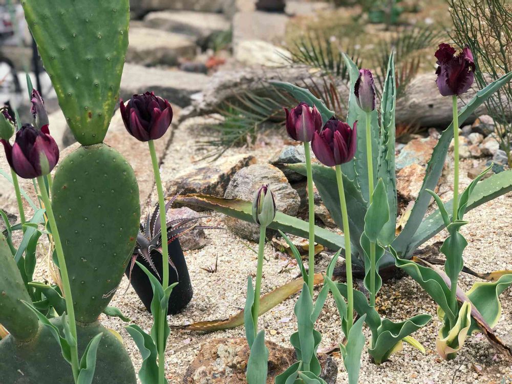ロックガーデンなので、ブラック系統のチューリップでまとめてみました!アガベとサボテンだけじゃ華が無いので。