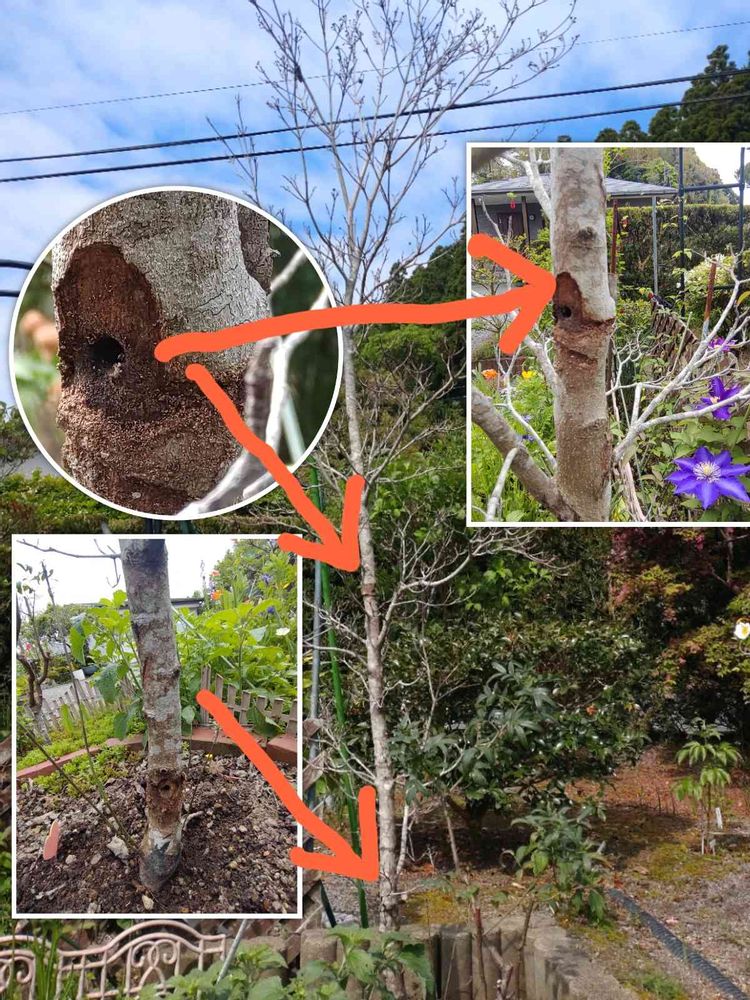 産卵時期が6〜10月頃なので殺虫剤を(ノズル付き)を穴から差し込み散布🐛