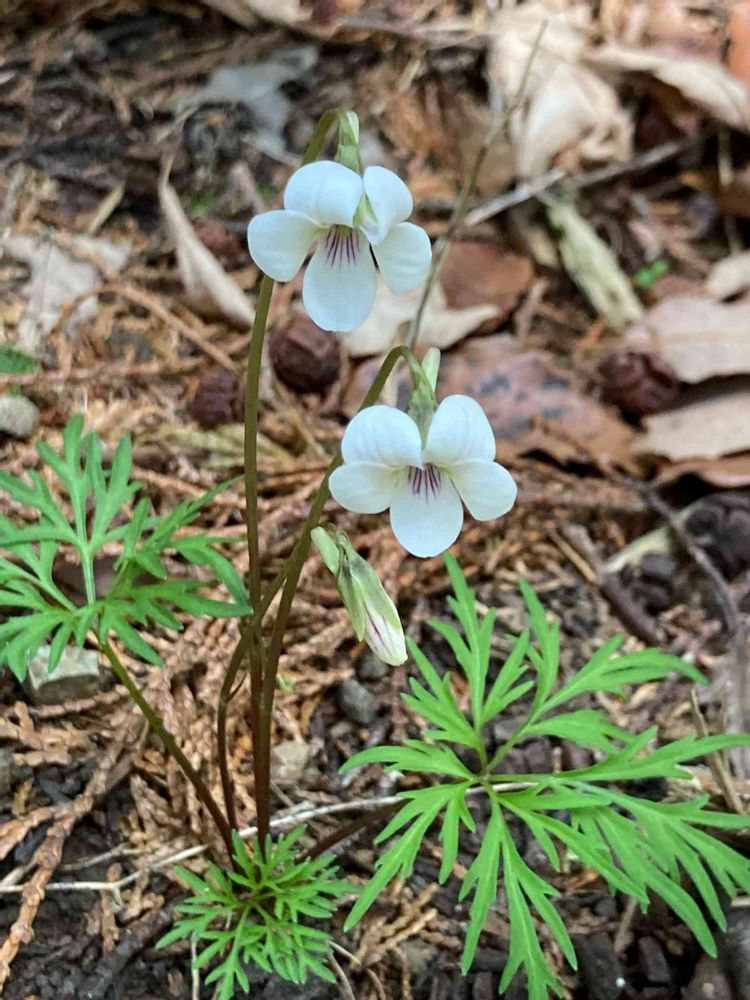 ヒゴスミレです❣️コスモスみたいな葉はエイザンスミレと似ているけど、小葉の幅が細く、ほぼ5全裂します。花弁は丸く、縁が波打ちません。花色は主に白ですが、西日本には淡紅色があるそうです。4/10静岡市にて