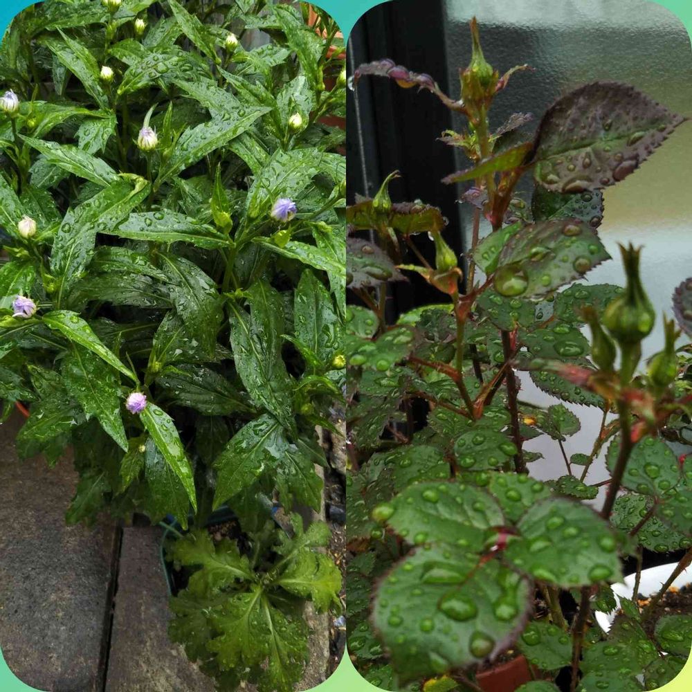 こんにちは😀蕾の日に参加させていただきます💜♥️都ワスレ、ミニバラです🤗雨の中で撮りました😅