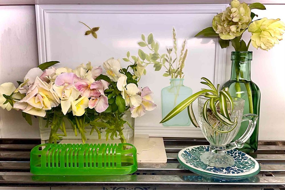 ビオラ,パンジーを空の冷蔵庫用脱臭ケースに入れて、流し台上に飾ってみました😊💐💗