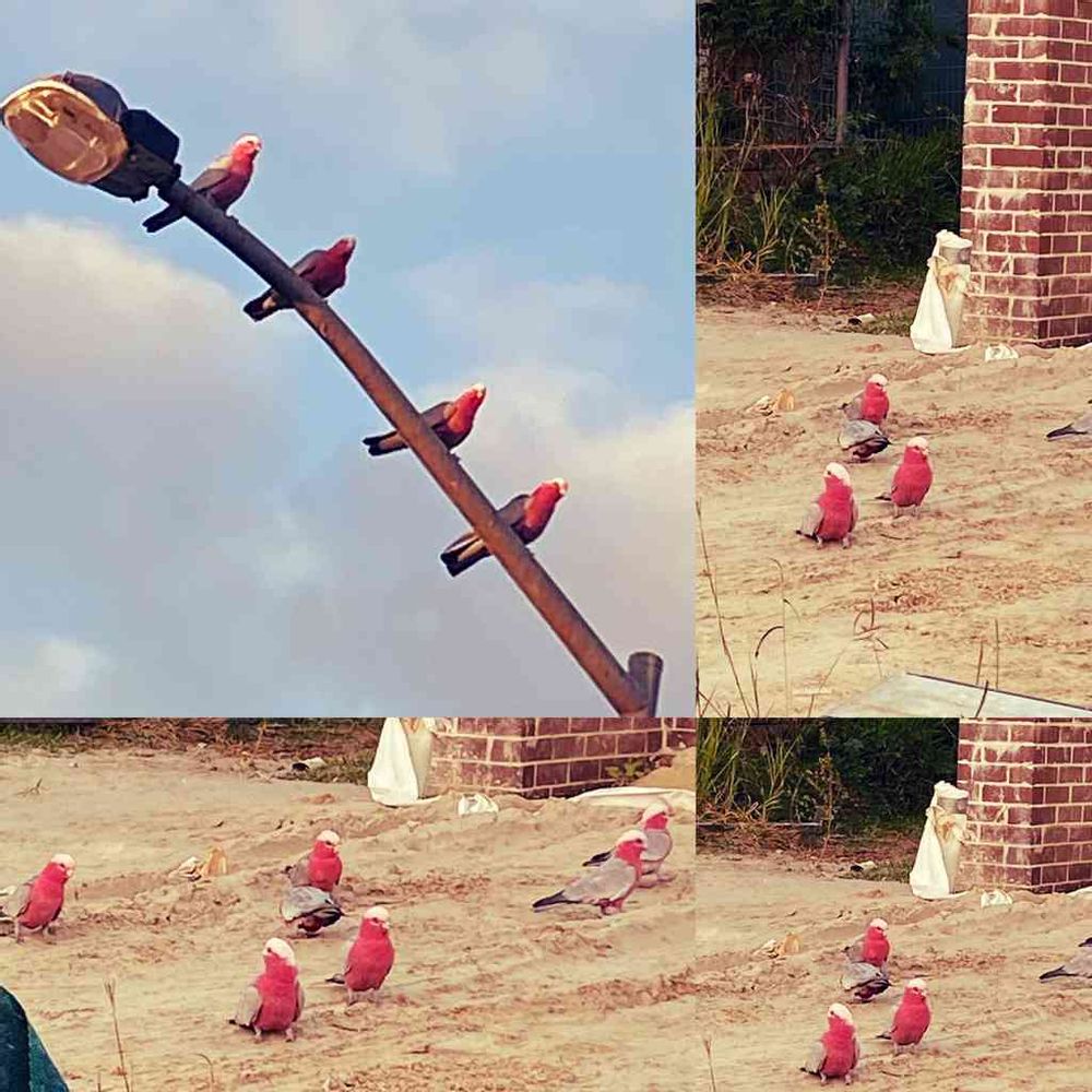 珍しく、モモイロインコ集団🦜💓💕が、地面に降りてなんかつついて食べてました〜