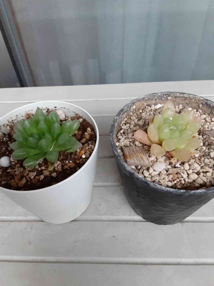 買ったときはどちらも同じ色やったのに、室内で育てた方は緑色になった。