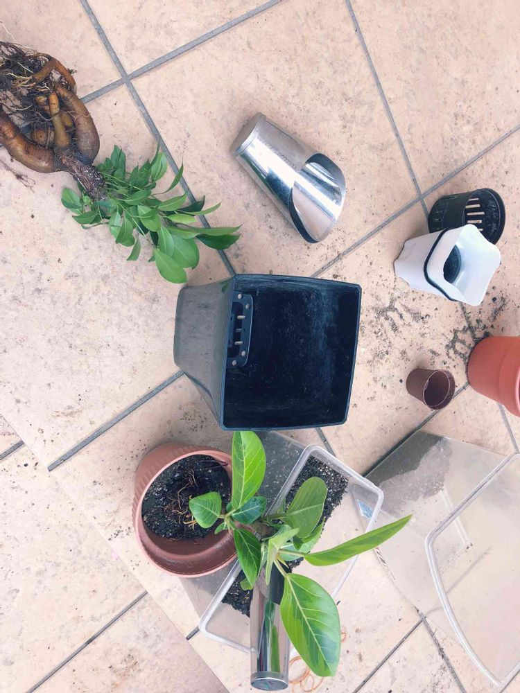 夢の島熱帯植物園で購入したガジュマル、ザ、ガーデン ヨネヤマプライテイション横浜店で購入したアルテシマの二種類のフィカスの植え替え中です。アルテシマの根が思ったより酷かった💦