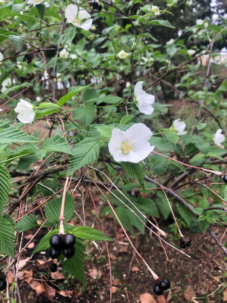 白いヤマブキの花と、ピカピカの4つの実。実は前年のものだそうです。かわいい😍