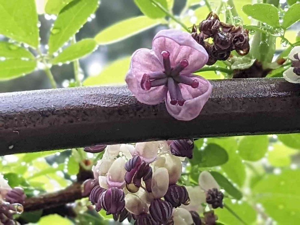 今朝は長らく待っていたアーチのアケビの雌花が咲いていました 可愛いです!このお花一つだけ萼が白く無くて薄っすらピンク 調べて読んでいたお花の色 白・紫・薄紫の薄紫がこの薄ピンクかしら?
