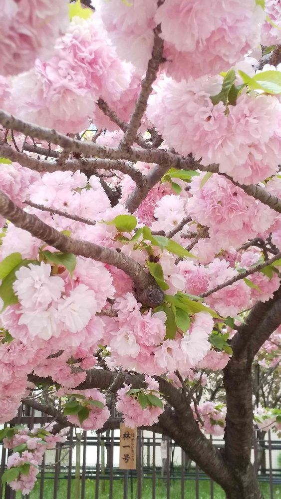 造幣局にて、八重桜「林一号」をパチリ!仙台の植木屋さん林氏が初めて育成した新しい八重桜です。🌸🌸😊🌞