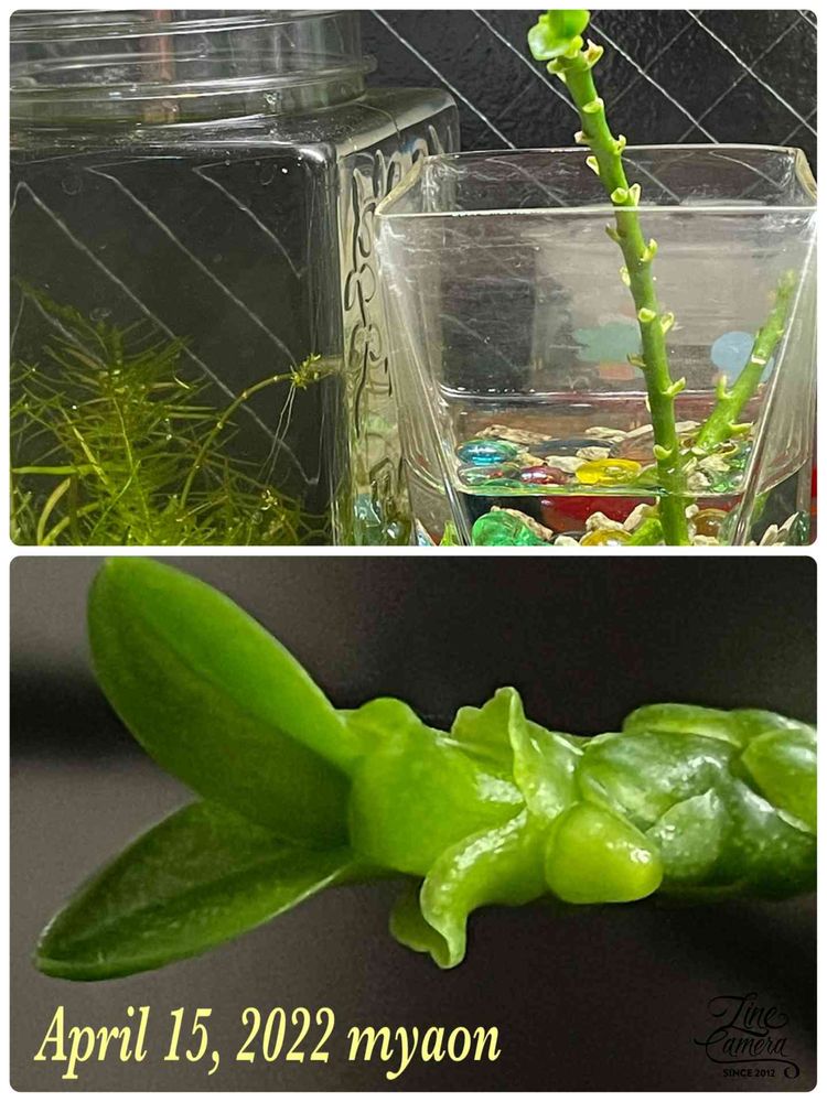 花が終わりかけの頃カットしてガラスの器に刺しておいた花茎から子株が発生したよぉ〜( ☉_☉) パチクリ。小さな芽から小さい根が出てきてるのでもう少し根の成長を観察してから植え替えようと思います。冬の間、かなり冷える窓辺なのに…我慢強いランなのね。
