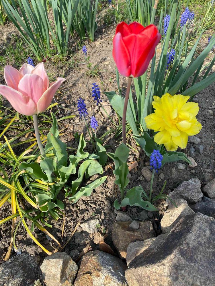 チュウリップ、ムスカリ、八重咲きラッパスイセンなど春の花が集合しとても綺麗でした🌸✨🌼