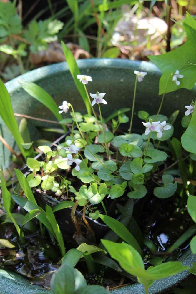 メダカが喜ぶ…というキャッチフレーズのナガバオモダカがいつの間にか睡蓮鉢の縁に移動して、元のプラスチック鉢には見たことのないスミレが陣取ってました😆