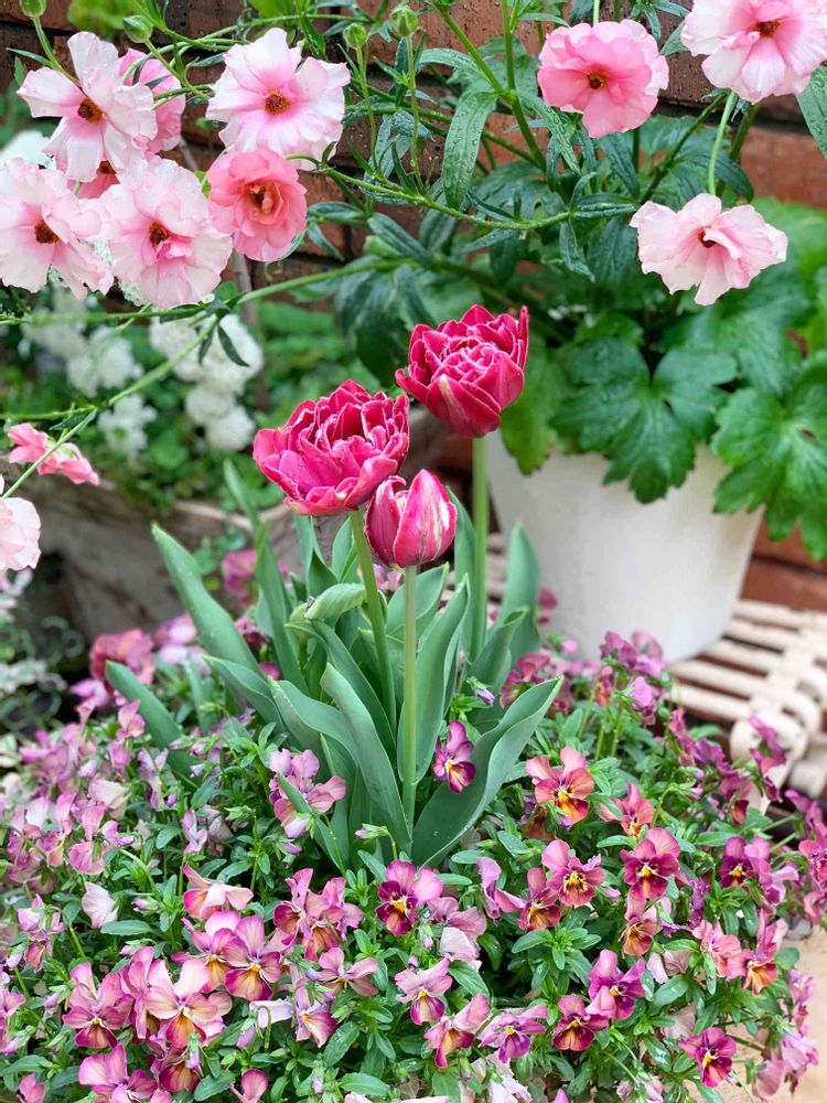 濃いピンクのチューリップ八重咲きが、ピンクのお花達に囲まれて祝福されているプリンセスのようですねー💖 カワイィです💗💕
