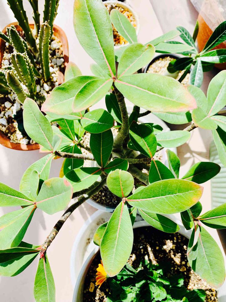 右上のチビアデニウムの葉っぱ🌱は、緑が濃くて固い葉っぱです。