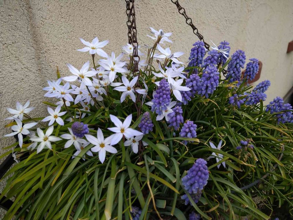 ムスカリとハナニラの紫系の寄せ植えハンギングです😄
