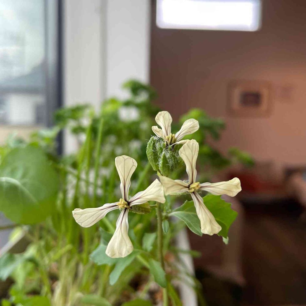 ルッコラが咲いちゃいました!(花が咲くと葉が硬くなるのでね)