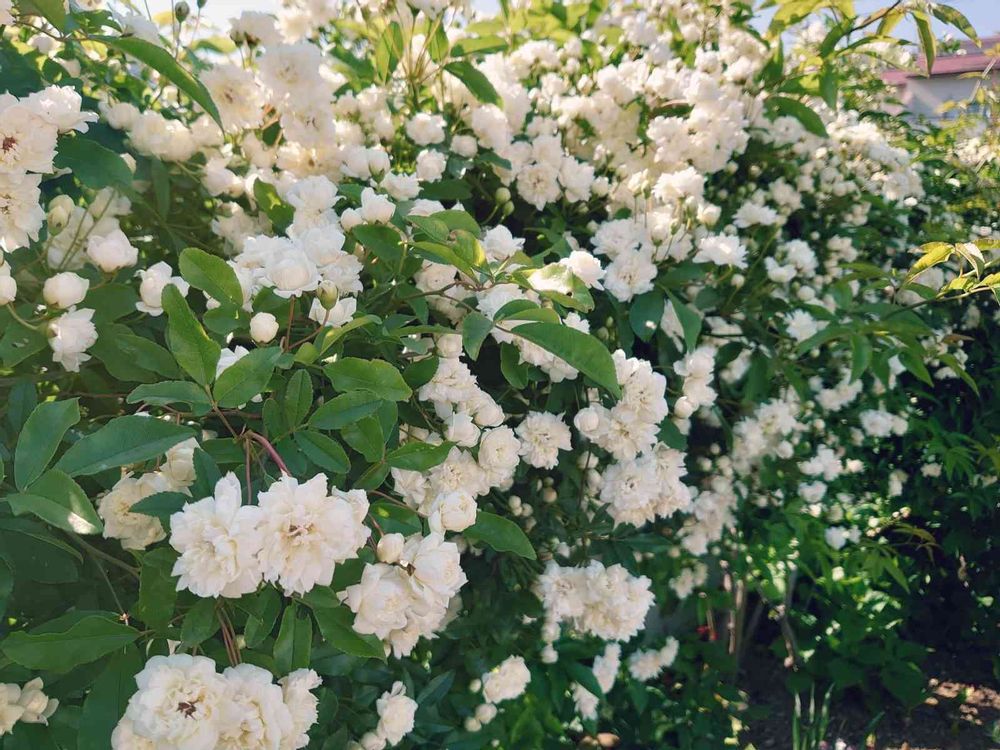 何もしなければ何メートルも伸びまくるモッコウバラを2メートル以内の高さで生垣化している我が家の白モッコウ