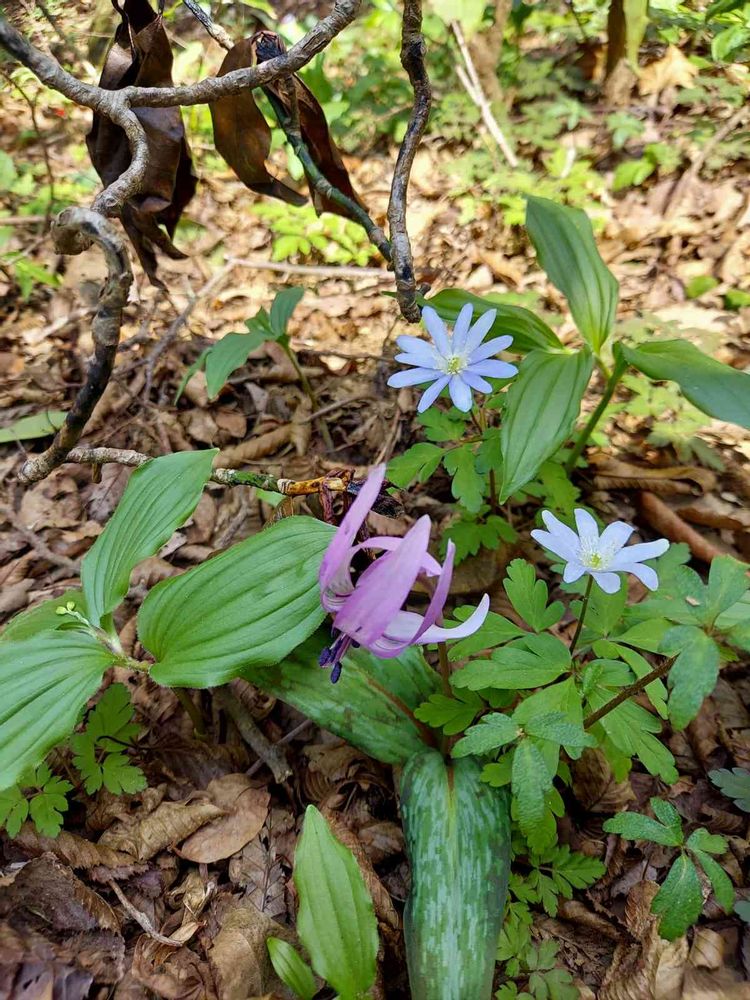 登山道脇で見つけたカタクリ💜クキザキイチゲ紫·白とユキザサ🌿のコラボ咲き💕🎶