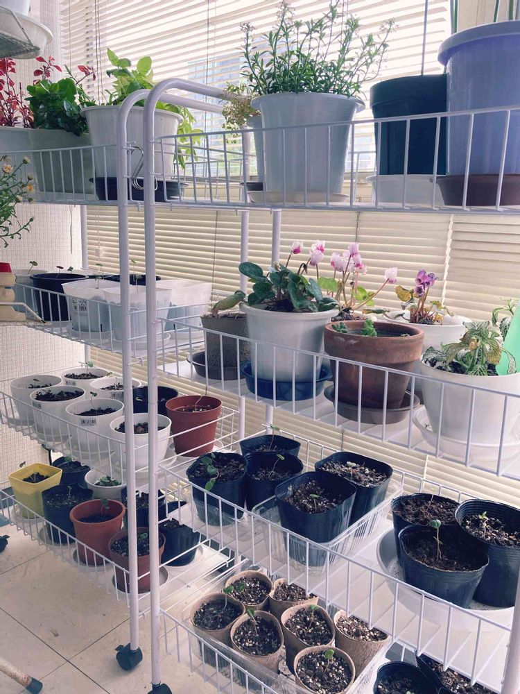 シクラメンを種から育てて置く場所がなくなってきたからワゴン買いました✨スッキリしたぁ🥳また増えたらワゴン買えばいいかなー笑