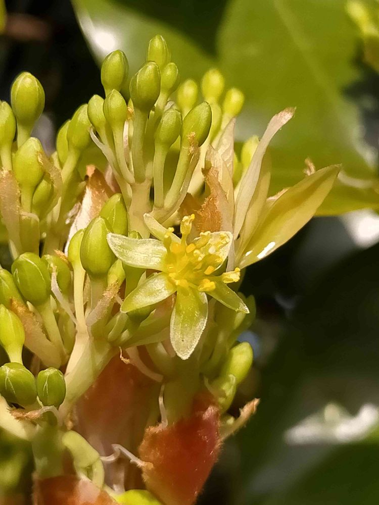 ウォーキングを兼ねて出かけた公園で、タブノキの花が開花したのを見ました。赤い新芽からやっと咲いてくれました。