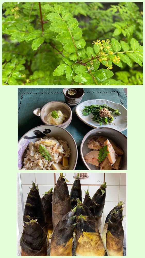 凄い‼️山椒の花、初めて見たよ。😄又、大きなタケノコですね👍