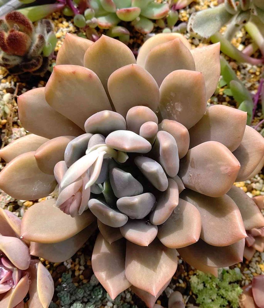 こちらはパキベリアで、パキフィツムとエケベリアの交配種なので濃い色の花が咲く可能性が高いですが、お目にかかったことがないので断定できません。