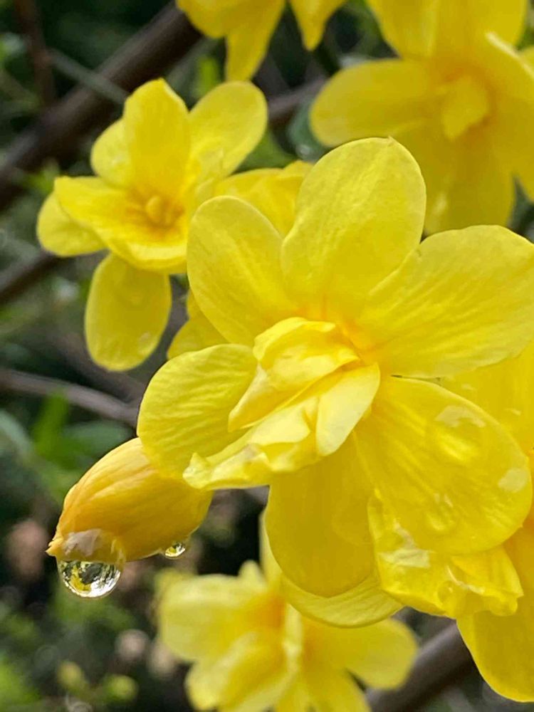 生命力にあふれた生き生き雲南黄梅が、雨ニモマケズ次々に咲いてきます