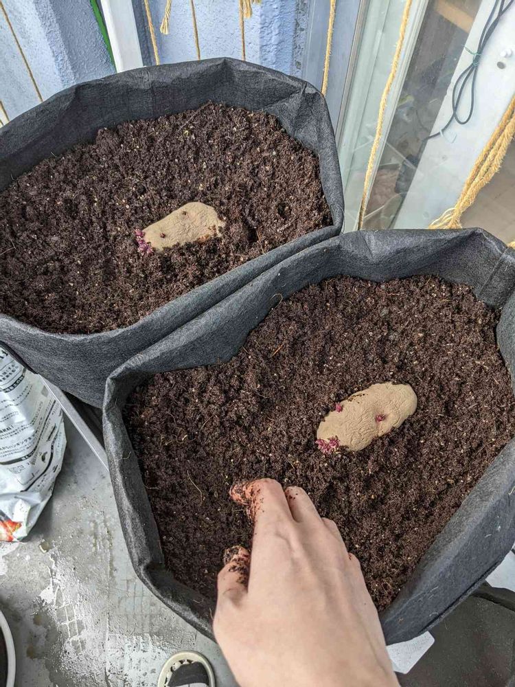 不織布プランターに軽い培養土を入れて植え付け。